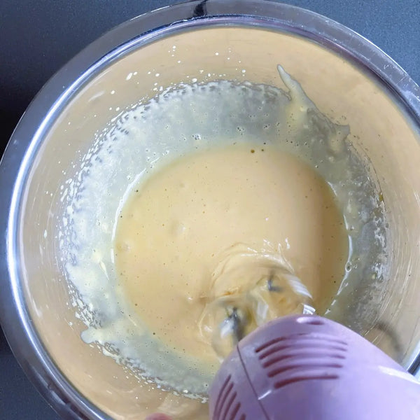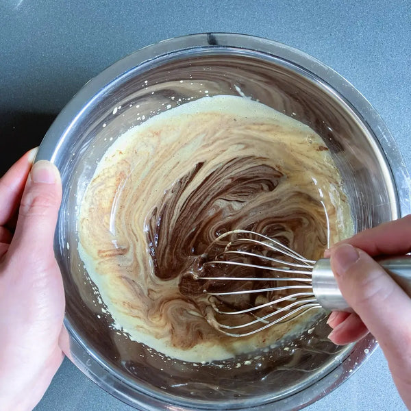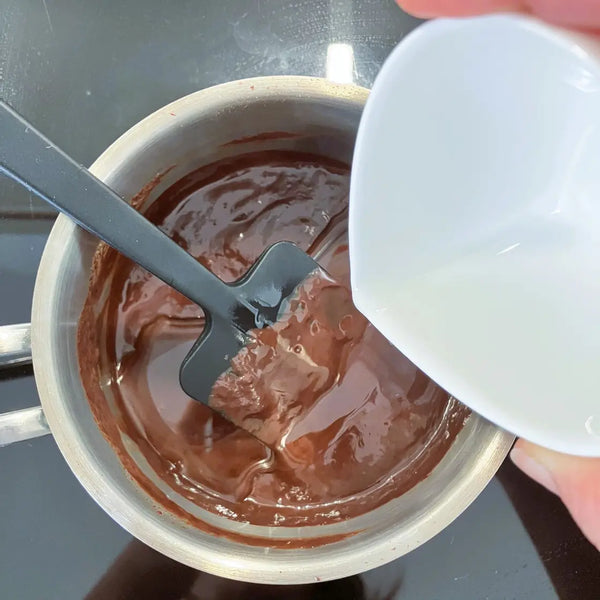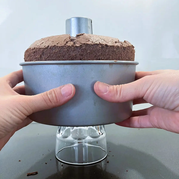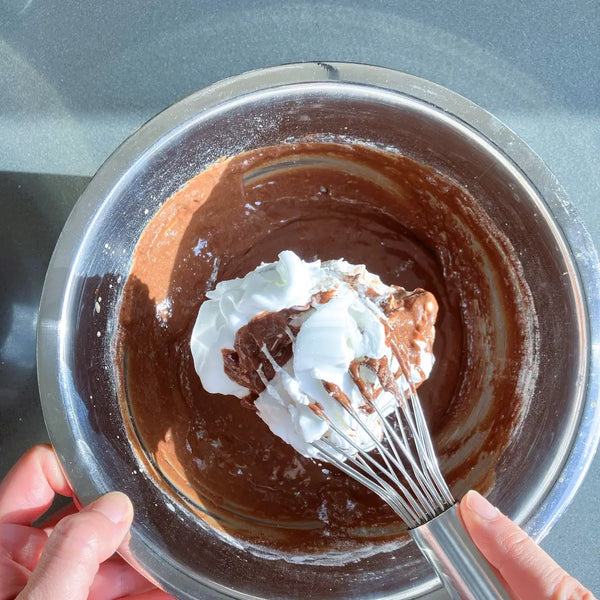 The key to making a good chiffon cake is the meringue. You must whip it enough to achieve a stiff meringue. It's important to quickly mix the batter and meringue and place it in a mold because chocolate contains fat and oil, which can easily collapse the air bubbles in the meringue.