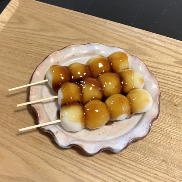 Mitarashi dango, a Japanese sweet, consists of rice dumplings skewered onto a wooden stick and topped with a sweet-soy sauce glaze. 'Dango' means dumplings in Japanese, and is often enjoyed as a snack or dessert along with a cup of hot green tea.