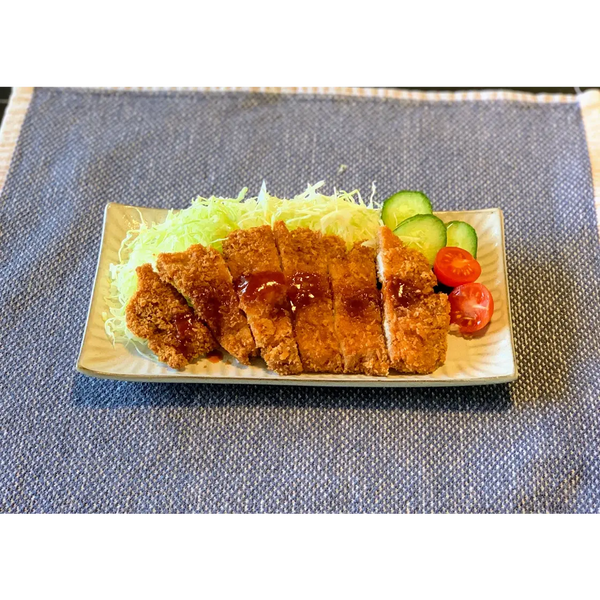 Tonkatsu is a Japanese home-style dish made of thick pieces of pork loin or fillet, coated in egg and flour, and wrapped in panko bread crumbs. It is then deep-fried and finished by being topped with tonkatsu sauce and served with vegetables such as shredded cabbage or tomatoes. Tonkatsu is often accompanied by miso soup and white rice.