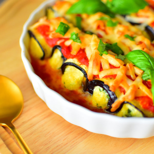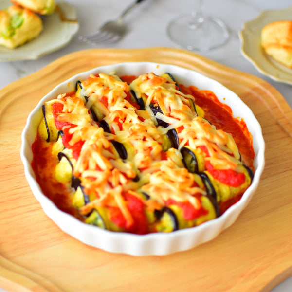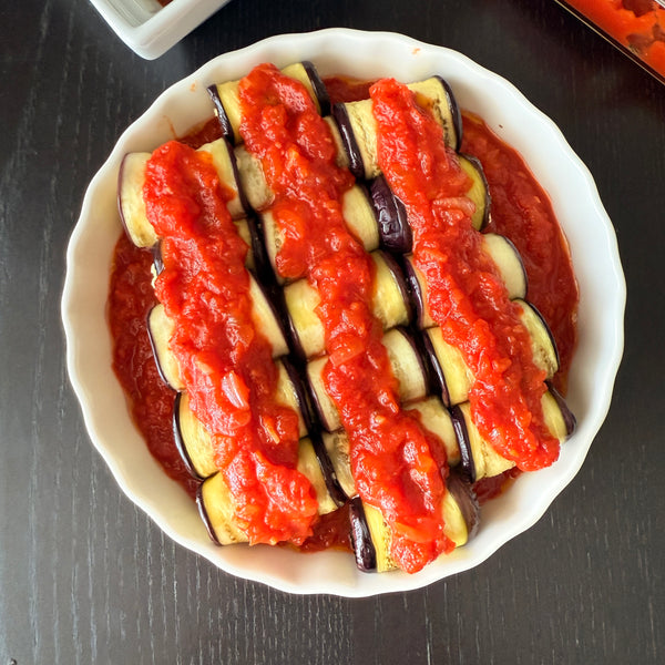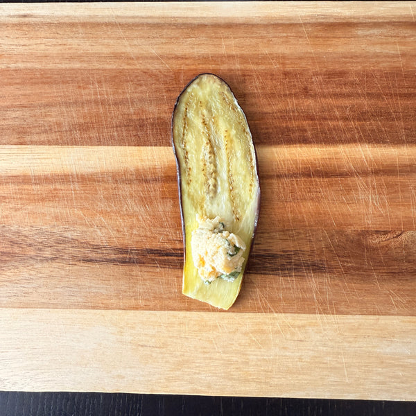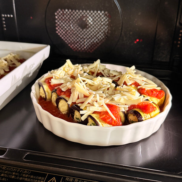Eggplant rollatini is made by rolling thin slices of cooked eggplant with a filling, such as ricotta cheese and herbs, then baking them in tomato sauce. While Japanese people are accustomed to eggplant dishes, Rollatini itself is not commonly known in Japan. However, Japanese eggplant’s tender skin and soft texture make it ideal for Rollatini, resulting in a juicy, smooth, melt-in-your-mouth bite. Additionally, its perfect size makes each roll manageable in a single bite.