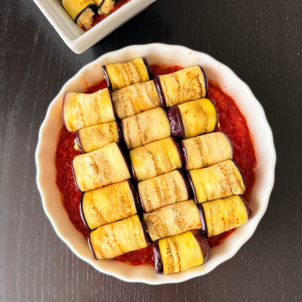 Eggplant Rollatini – This Italian-American dish is inspired by the classic Italian “Involtini di Melanzane.” Eggplant slices are rolled with ricotta (sometimes other cheeses) and herbs, then baked with marinara sauce. Cooking methods vary by household; some bread and deep-fry the slices, while others sauté or pan-fry them for a lighter version—perfect for an appetizer. In this recipe, we use Japanese eggplants with a simple oven-baked method, delicious both hot and cold.