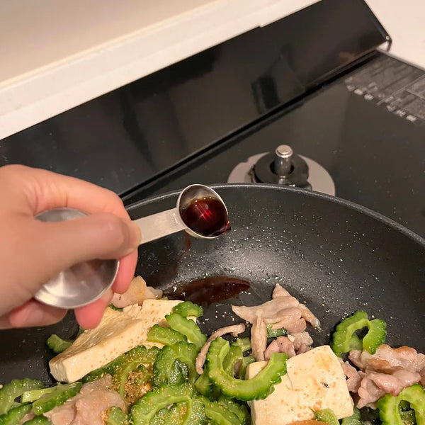 As mentioned above, shima-dofu is used to make an authentic goya champuru. Shima-dofu is a firm-typed, big, dense block of tofu. It is native to Okinawa. The ingredients are the same as ordinary tofu, but the process of making it is different. Shima-dofu is made by crushing soybeans soaked in water. It is squeezed and separated into soy milk and raw Okara (soy pulp). Then, bittern is added to the soy milk. After simmering, the soy mixture is placed into a mold and drained thoroughly. This makes the texture of Shima-dofu unique.
