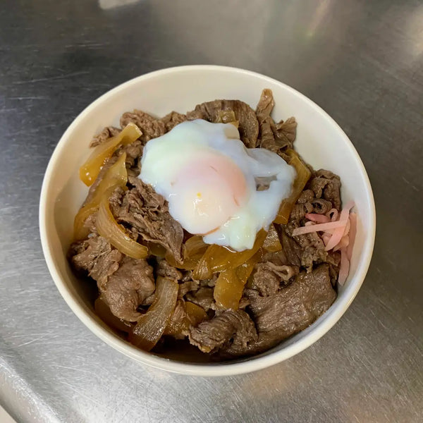 Originally, onsen tamago was boiled in hot spring steam and served in hot spring resorts, thus receiving the name "onsen (hot spring)" tamago. The tender eggs pair lovely with the stewed beef and onions, and the base of rice ties everything together.