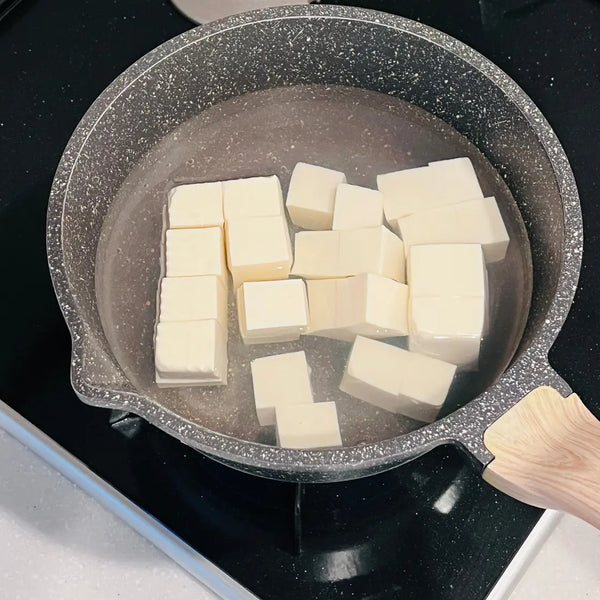 A crucial step in making tasty mapo tofu is preparing the tofu properly. As explained in our agedashi tofu recipe, Japan commonly uses two main types of tofu, firm (momen) and soft (kinugoshi). Either one can be used for mapo tofu, depending on your preference for texture.