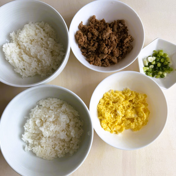 Spoon the pork on one half of each rice bowl and the scrambled egg on the other half. Keep the edges clean for visual appeal.