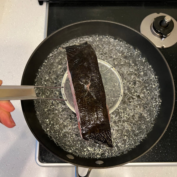 Do “shimofuri” as preparation: Shimofuri is a Japanese technique where fish is briefly soaked in boiling water until the surface turns white. This process helps remove any odor and makes it easier to remove the scales.
