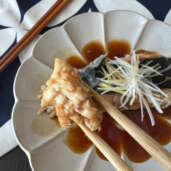 Sakana no nitsuke refers to fish simmered in a sauce typically made with soy sauce, sugar, mirin, and sake. The sauce has a sweet, soy sauce-based flavor that is characteristic of many traditional Japanese dishes.